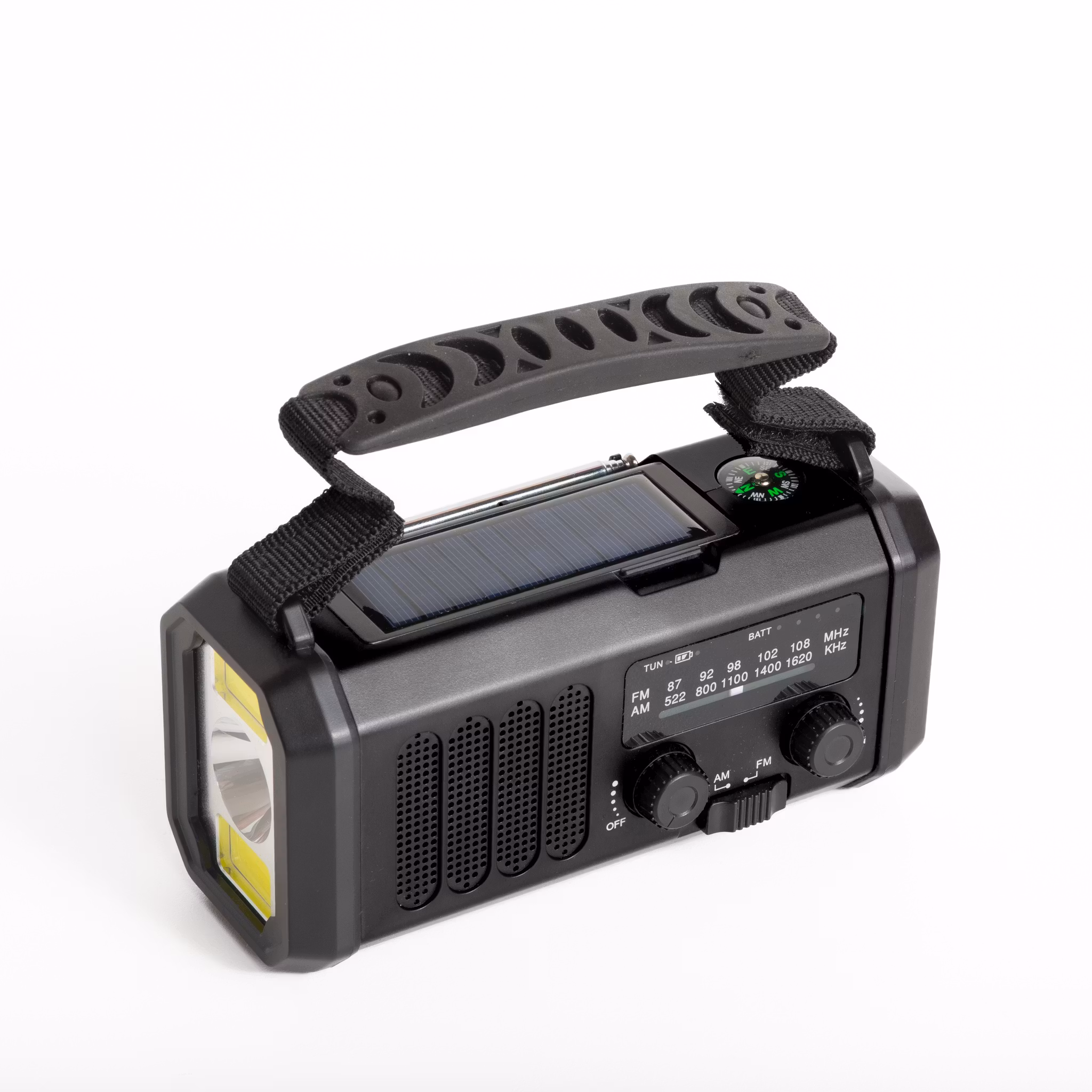 Three smart charging options: USB Type-C, solar panel, and hand crank – so you never run out of power.