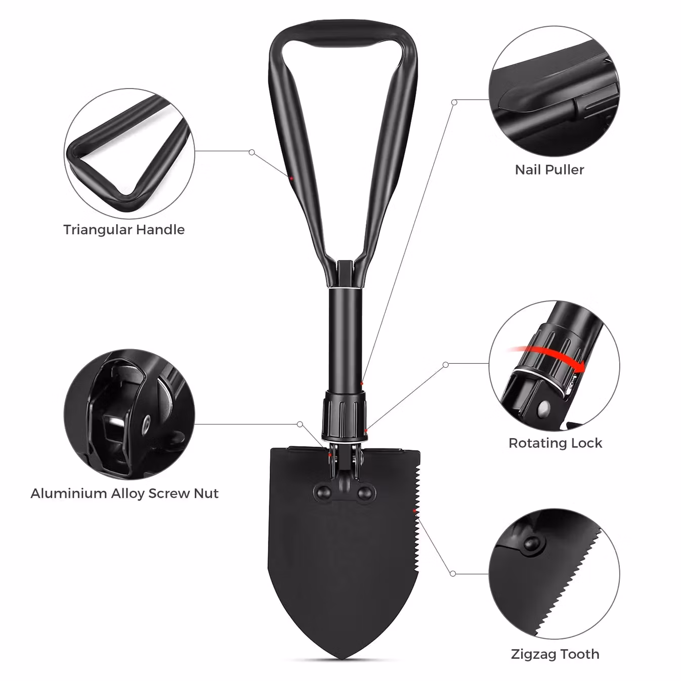 Foldable, sturdy metal shovel with ice pick. Powder-coated. Comes with a storage bag.