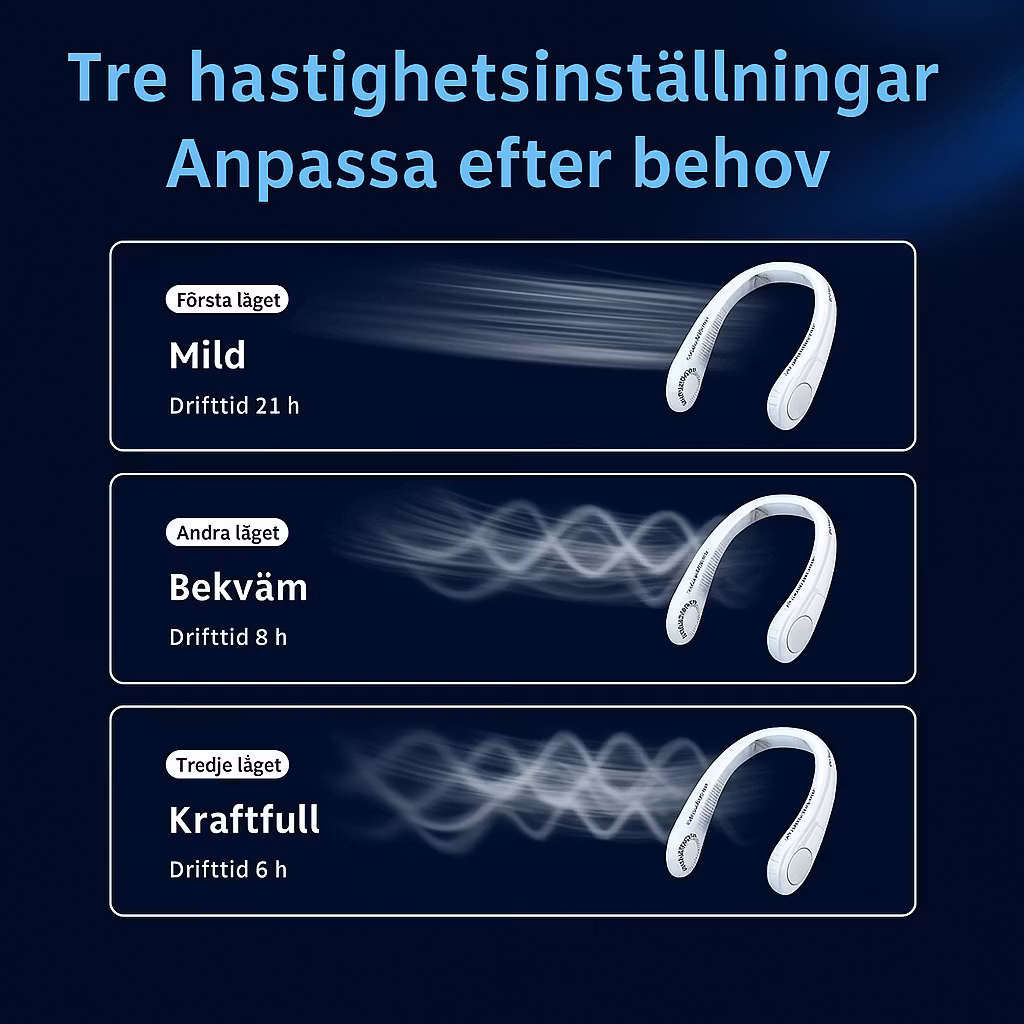 Hurricane™ is a portable neck fan designed to provide targeted cooling in hot work environments and during outdoor activities where increased heat exposure occurs. The fan is ergonomically shaped and rests comfortably around the neck without restricting movement or work ability. With a low weight of only 273 grams and a flexible, bendable design, the airflow adapts to the user’s needs.