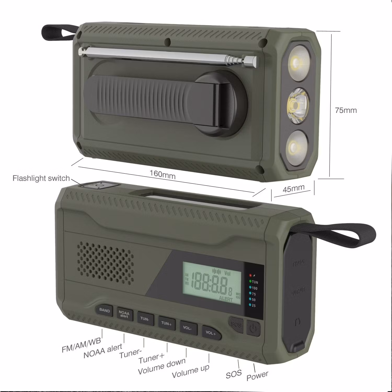 - The radio has four power sources: built-in rechargeable battery, solar power, hand crank, and replacement batteries.