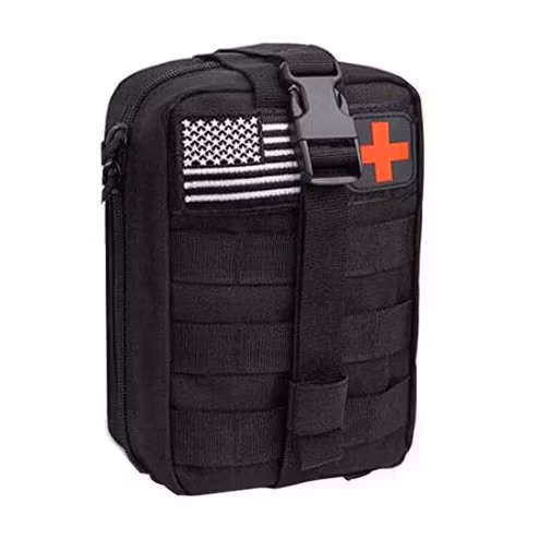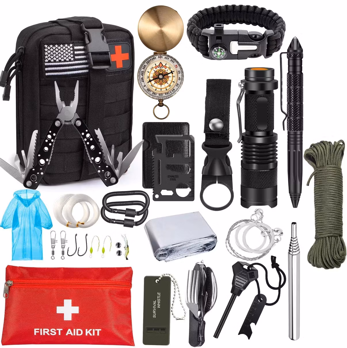 Includes, among other things, a flashlight, first aid kit, compass, and rope.