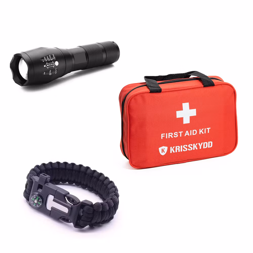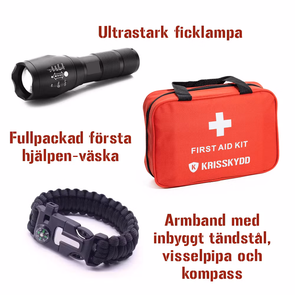 The Protection Package includes:1 x First Aid Kit1 x Survival Bracelet1 x Strongflash Flashlight