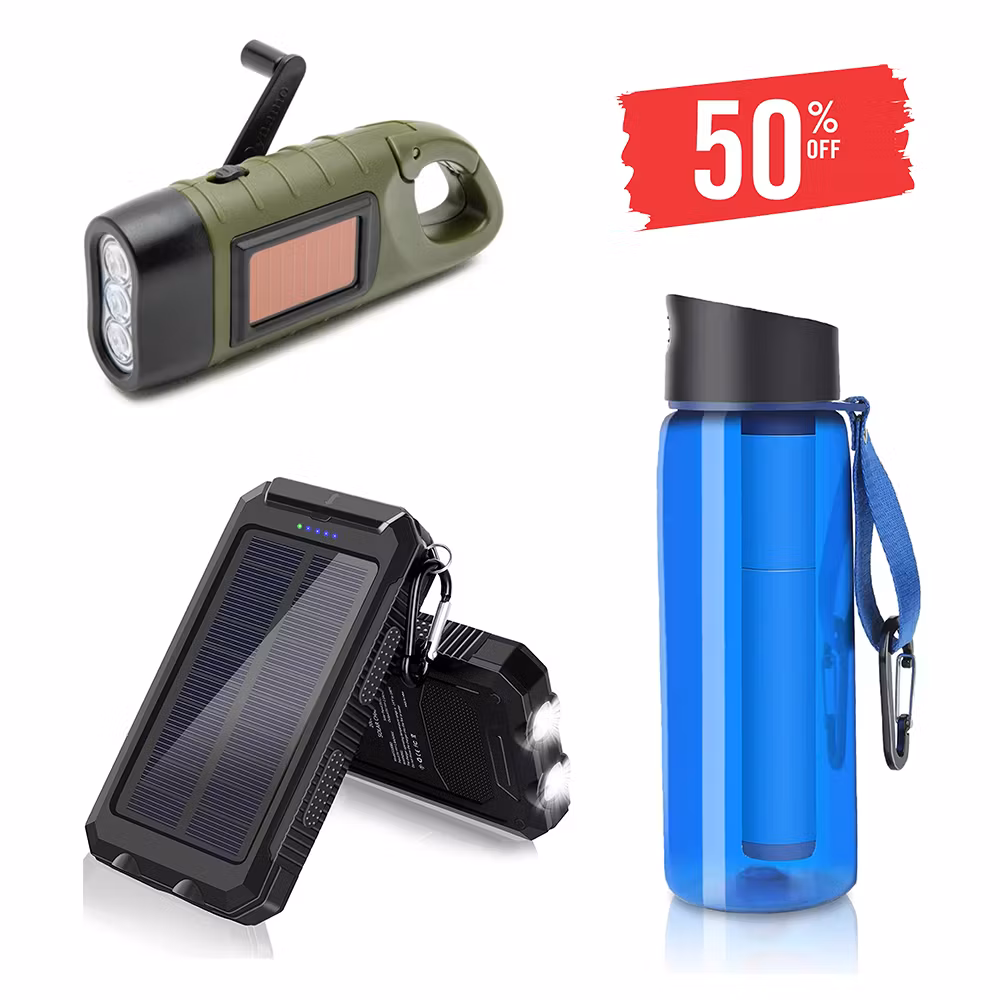 The SOS package includes 3 of the essential products you need at home in a crisis: a bottle with an integrated water purification filter, a flashlight that never runs out, and a high-quality power bank.