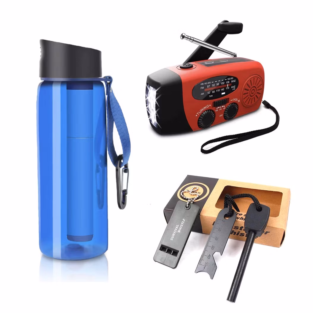 The Swedish Survival Kit includes 3 essential products that you need to have in your home in case of an emergency: a hand-crank radio, a bottle with an integrated water purification filter, and a lighter.